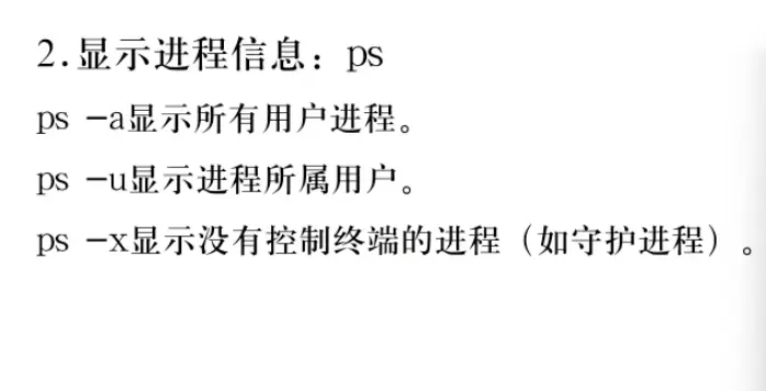 psps -a: 显示所有用户进程。ps -u: 显示进程所属用户。ps -u <username>来显示指定用户的进程ps -x: 显示没有控制终端的进程(如守护进程)。