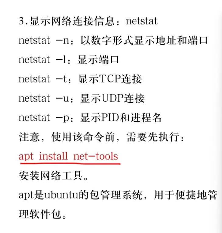 netstat命令:显示网络连接信息。netstat -n: 以数字形式显示地址和端口而不进行 DNS 解析。netstat -l: 显示监听端口。netstat -t: 显示 TCP 连接。netstat -u: 显示 UDP 连接。netstat -p: 显示 PID 和进程名。- 示例:
