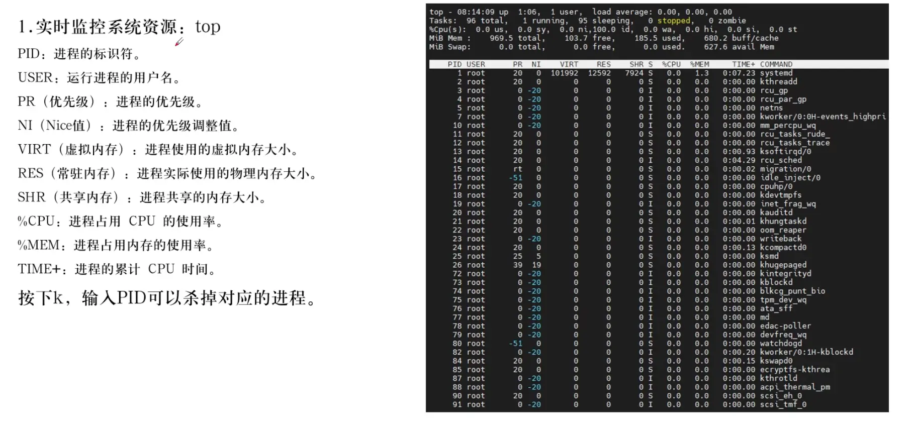 top命令:实时监控系统资源。- PID:进程的标识符。